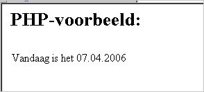 <html><head><title>PHP-voorbeeld</title></head><body><h1>PHP-voorbeeld: </h1>Vandaag is het <?PHP echo date("d.m.Y",time()); ?></body></html>