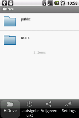 Na het inloggen bevind je je in de rootmap van je HiDrive account. De "Public" en "Users" mappen worden getoond. Navigeer d.m.v. het aantikken van de mappen naar de gewenste map/het gewenste bestand.