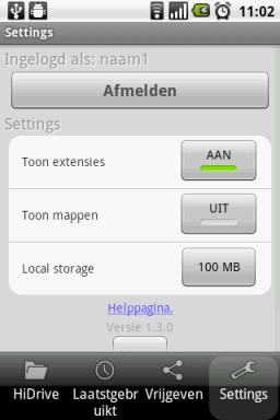 Wil je de verbinding met je HiDrive beëindigen, tik dan op het symbool Settings en vervolgens op Afmelden.