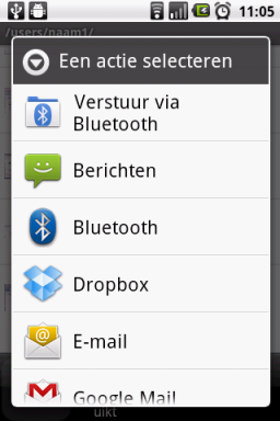 Kies een bestand en druk een langere tijd op dat bestand. Kies E-Mail versturen. Je kunt het gekozen bestand dan als attachment per E-mail of via Bluetooth verzenden.