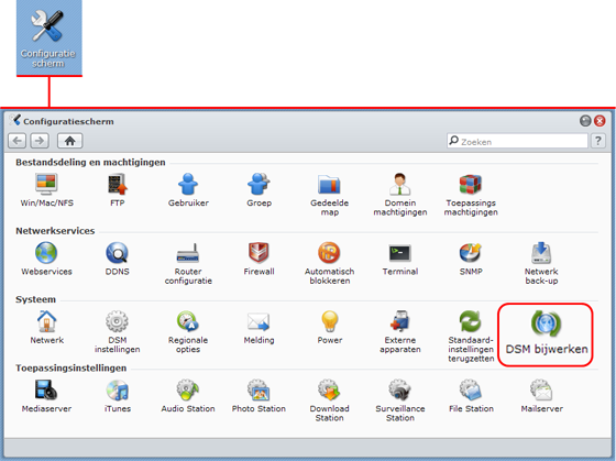 Ga na het inloggen naar het Configuratiescherm, selecteer nu de optie DSM bijwerken.