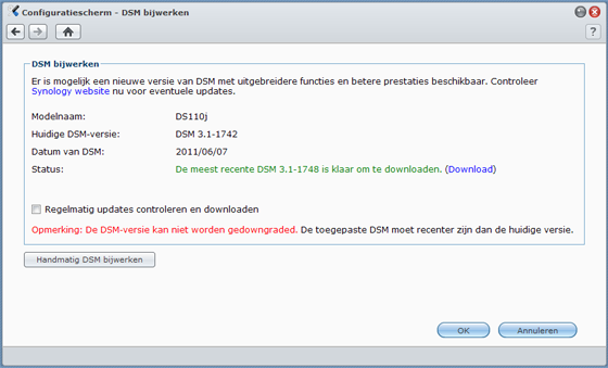 De actuele firmware van je NAS kan je vinden op de downloadpagina van Synology: http://www.synology.com/support/download.php