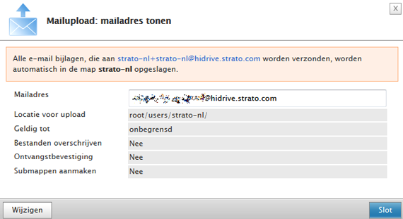 Wanneer u de feature Mailupload gebruikt, verandert het e-mailadres omdat hiervoor het HiDrive gebruikersaccount als deel van het e-mailadres wordt gebruikt. Stelt u alstublieft de ontvangers op de hoogte van deze wijziging van het e-mailadres. U kunt het actuele e-mailadres weergeven door met de rechtermuisknop op de mailupload-map te klikken.