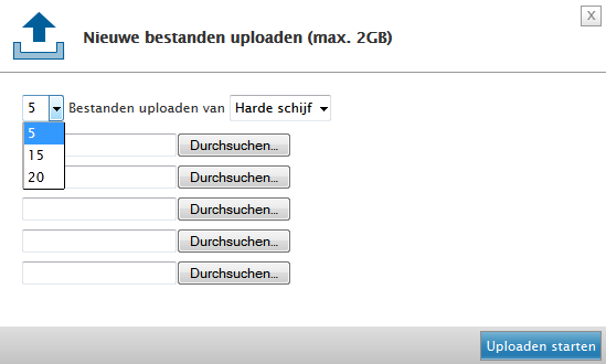 Je kunt maximaal 20 bestanden in één keer van je lokale map selecteren en uploaden. Druk hiervoor op de knop Doorzoeken en bevestig vervolgens je keuze door op Uploaden starten te klikken.