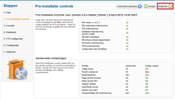 Tijdens de volgende stap wordt de installatiecontrole gedaan. Gebruikers van STRATO Hosting pakketten hoeven hier in de regel geen wijzigingen door te voeren. Dit omdat het pakket reeds correct geconfigureerd is. Bij de installatie op een eigen server kan het voorkomen dat je wijzigingen in je serverconfiguratie moet doorvoeren.
