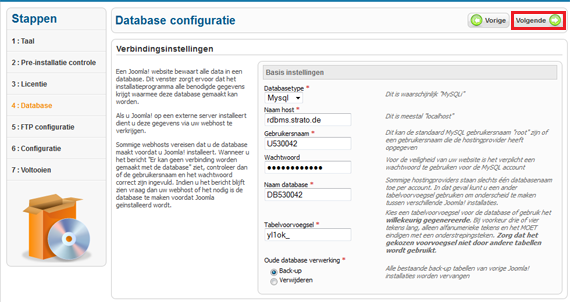 Bij stap 3 van de installatieprocedure worden nogmaals de licentieovereenkomsten van de GNU General Public Licence getoond, met de knop ´volgende´ ga je verder naar de volgende installatiestap. Neem voor dit punt de gegevens van je MySQL database die je hebt aangelegd bij de hand.