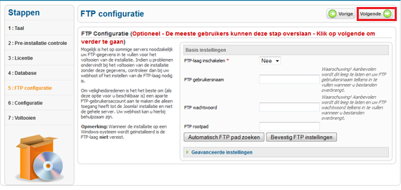 In de volgende stap van de installatie kunnen de FTP-instellingen geconfigureerd worden. Deze FTP-laag biedt een alternatieve methode voor de upload van modules/componenten. Deze optie is momenteel alleen te gebruiken door klanten met een eigen server.