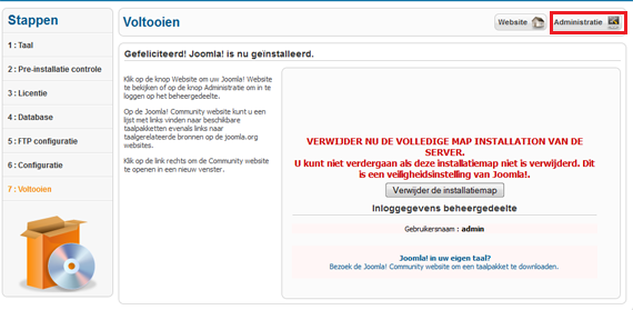 Nieuwe gebruikers van Joomla raden we aan de voorbeeldgegevens te installeren, deze maken het makkelijker te eerste stappen in Joomla te ondernemen. In de volgende stap wordt de installatie van Joomla afgerond. Het is noodzakelijk dat je via je FTP-toegang de map /installation van je webspace verwijdert. Pas nadat deze map verwijderd is kan het administratiepaneel opgeroepen worden.
