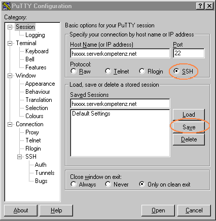 Om in te loggen start je eerst Putty. Hier voer je de hostname of het IP-adres van je server in. Voer poort 22 in. Controleer of het protocol SSH is geselecteerd en klik op open om te verbinden met de server.