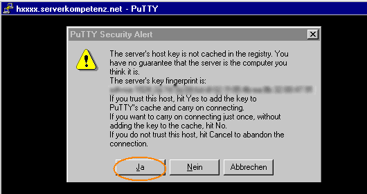 Klik op "ja" om aan te geven dat je vertrouwt dat deze fingerprint bij jouw server hoort.