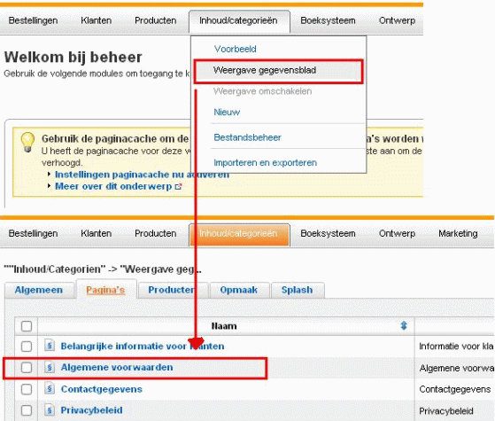 De algemene voorwaarden kun je in de shop-administratie (Webshops- Log hier in voor je webwinkel) onder het punt "Inhoud/categorieën" onder "Weergave gegevensblad" bewerken. Klik daarvoor alstublieft onder de kolom "Naam" op "Algemene voorwaarden" (Type: "Algemene voorwaarden").