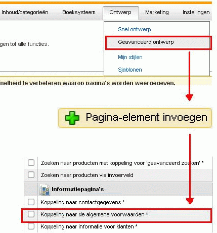Dit kun je in de shop administratie onder het punt "Ontwerp" uitvoeren. Het pagina-element kun je terugvinden onder het onderdeel "Informatiepagina's".