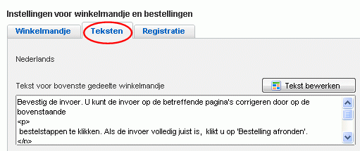 De bestelbevestigingspagina kan je in jouw shop-administratie (Webshops- Log hier in voor je webwinkel) onder het punt Instellingen > Instellingen winkelmandje middels het tabblad Teksten bewerken.