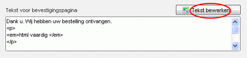 Je hebt onder het veld Tekst voor bevestigingspagina de mogelijkheid de bestelbevestigingspagina te bewerken. Je kan de pagina daarbij met behulp van een WYSIWYG-editor aanpassen door op de knop Tekst bewerken te klikken.