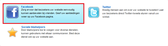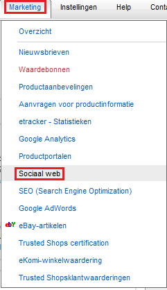 Het beheer van de sociaalweb functie van je webshop vind je onder het menupunt Marketing / sociaal web. Op de volgende pagina vind je de beschikbare diensten en kun je daar uit jouw favoriete dienst(en) selecteren.