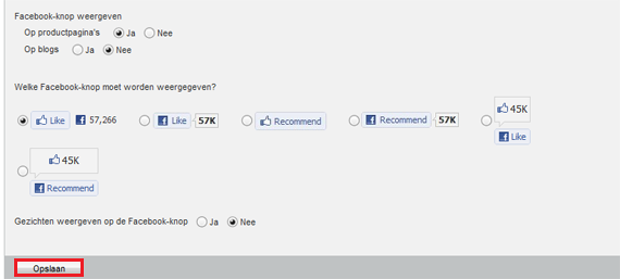 Activeer hiertoe de functie Facebook-knop weergeven op productpagina's en kies het gewenste ontwerp voor de Facebook-knop uit.