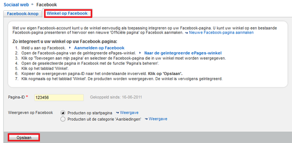 Vul het Pagina-ID in onder het menupunt op Marketing > Sociaal web > Winkel op Facebook.