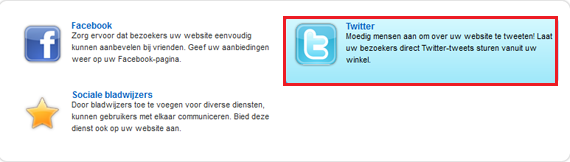 Je kunt de Twitterfunctie ook op andere pagina's laten weergeven. Gebruik hiervoor gadgets zoals "Tweet this" of "Follow me", deze kun je in tekstvelden van je shop invoegen.