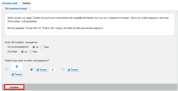 Ook zonder eigen Twitter account kun je je bezoekers de mogelijkheid bieden over je producten te Twitteren. Leg vast of je de knop "Dit tweeten" op productdetailpagina's wilt integreren. Je kunt dit direct onder het menupunt Marketing > Sociaal Web > Twitter aangeven.