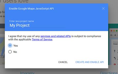 - Vervolg het proces door op ‘GET A KEY’ te klikken, de naam van je project in te voeren en de gebruikersvoorwaarden te accepteren. Wanneer je op ‘CREATE AND ENABLE API’ klikt, krijg je de Google Maps API-key te zien.
